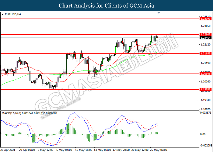 EURUSD, H4: EURUSD telah didagang dengan lebih tinggi sementara kini menguji di tahap rintangan 1.2260. Namun, MACD yang memaparkan momentum bullish yang berkurangan mencadangkan pasangan ini untuk mengalami pembetulan teknikal bagi jangka pendek.