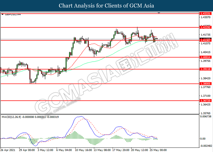 GBPUSD, H4: GBPUSD telah didagang dengan lebih rendah sementara kini menguji di tahap sokongan 1.4130. MACD yang memaparkan momentum bearish mencadangkan pasangan ini untuk melanjutkan kerugiannya selepas ia memecah tahap sokongan tersebut.