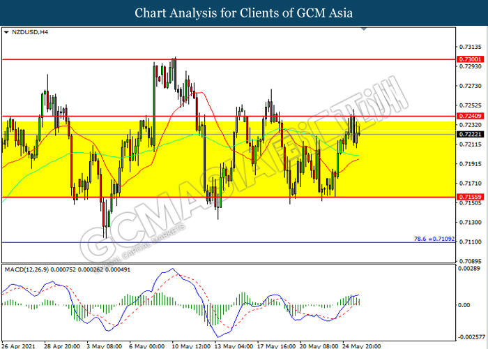 NZDUSD, H4: NZDUSD telah didagang dengan lebih tinggi sementara kini menguji di tahap rintangan 0.7240. Namun, MACD yang memaparkan momentum bullish yang berkurangan mencadangkan pasangan ini untuk mengalami pembetulan teknikal bagi jangka pendek.