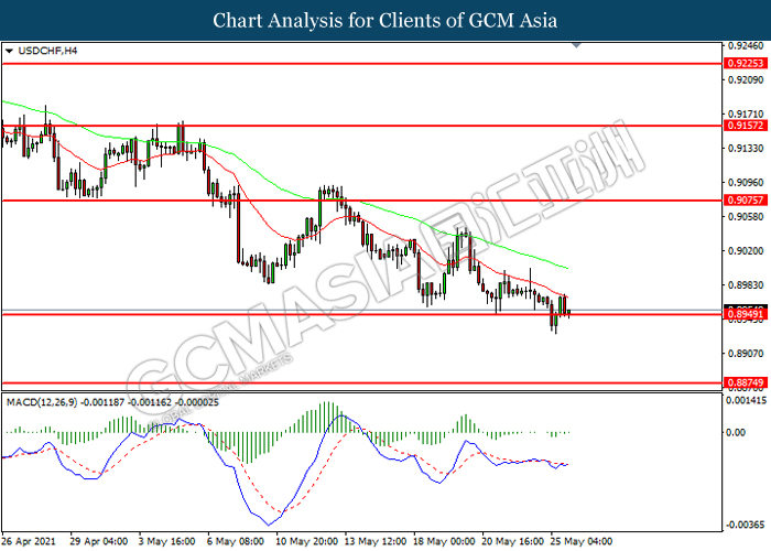 USDCHF, H4: USDCHF telah didagang dengan lebih rendah sementara kini menguji di tahap sokongan 0.8950. Namun, MACD yang memaparkan momentum bearish yang berkurangan mencadangkan pasangan ini untuk mengalami pembetulan teknikal bagi jangka pendek.
