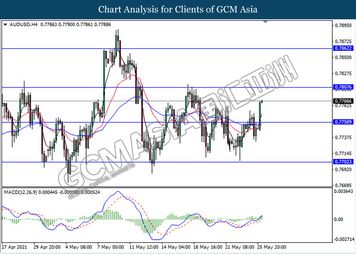 AUDUSD, H4: AUDUSD telah didagang dengan lebih tinggi susulan dengan pemecahan pada tahap rintangan sebelumnya 0.7805. MACD yang memaparkan isayrat momentum bullish mencadangkan pasangan ini untuk melanjutkan keuntungannya ke arah tahap rintangan 0.7805.