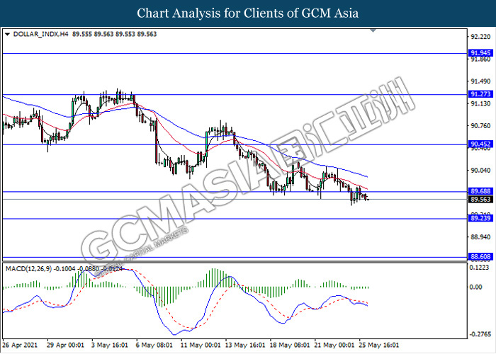 DOLLAR_INDX, H4: Indeks dolar telah didagang dengan lebih rendah susulan dengan pemecahan pada tahap sokongan sebelumnya 89.70. MACD yang memaparkan isyarat bias bearish mencadangkan dolar untuk melanjutkan kerugiannya selepas ia memecah tahap sokongan 89.25.