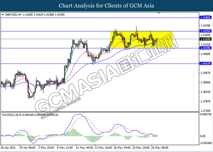 GBPUSD, H4: GBPUSD kekal didagang dalam saluran sisi susulan dengan lantunan dari tahap sokongan 1.4105 baru-baru ini. Namun, MACD yang memaparkan isyarat momentum bearish yang berkurangan mencadangkan pasangan ini untuk didagang dengan lebih tinggi ke arah tahap rintangan 1.4205.