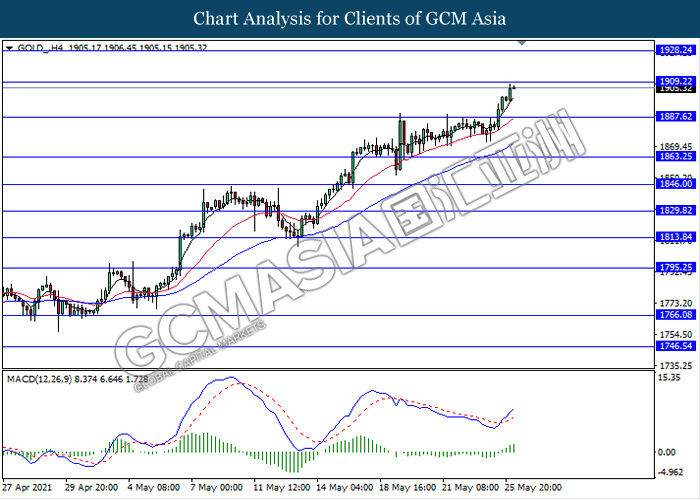 GOLD_, H4: Harga emas telah didagang dengan lebih tinggi sementara ia sedang menguji tahap rintangan 1909.00. MACD yang memaparkan isyarat momentum bullish dengan formasi silang emas mencadangkan komoditi ini untuk melanjutkan keuntungannya selepas ia memecah tahap rintangan tersebut.