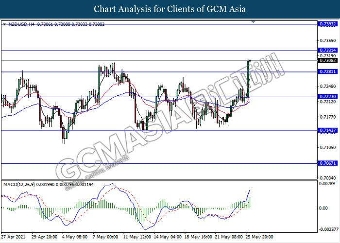 NZDUSD, H4: NZDUSD telah didagang dengan lebih tinggi susulan dengan pemecahan pada tahap rintangan sebelumnya 0.7280. MACD yang memaparkan isyarat momentum bullish yang berterusan mencadangkan pasangan ini untuk melanjutkan keuntungannya ke arah tahap rintangan 0.7330.