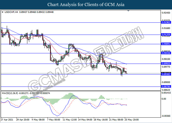 USDCHF, H4: USDCHF telah didagang dengan lebih rendah sementara ia sedang menguji tahap sokongan 0.8940. MACD yang memaparkan isayrat bias bearish mencadangkan pasangan ini untuk melanjutkan kerugiannya selepas ia memecah tahap sokongan tersebut.