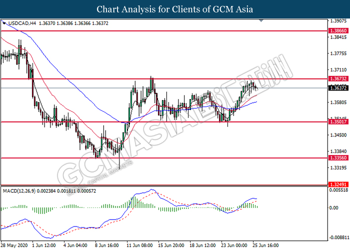 USDCAD, H4: USDCAD telah didagang dengan lebih rendah selepas ia berundur dari tahap rintangan di 1.3675. MACD yang memaparkan momntum bullish yang berkurangan mencadangkan pasangan ini untuk melanjutkan kerugiannya dan menuju ke arah tahap sokongan di 1.3500.