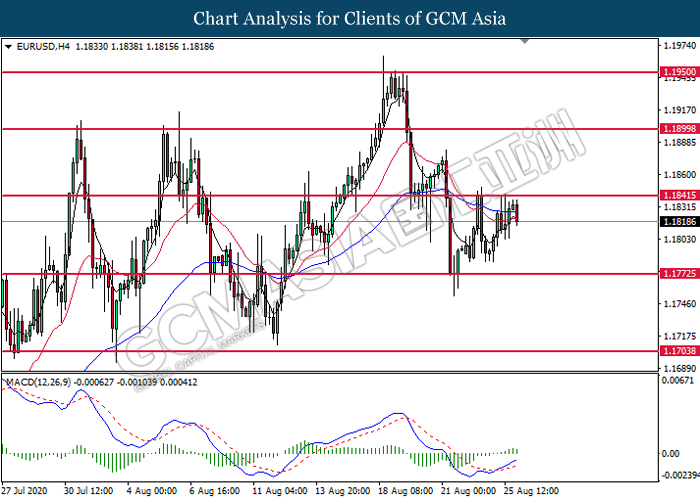EURUSD, H4: EURUSD telah didagang dengan lebih rendah selepas ia berundur dari tahap rintangan di 1.1840. MACD yang memaparkan isyarat momentum bullish yang berkurangan mencadangkan pasangan ini untuk melanjutkan kerugiannya dan menuju ke arah tahap sokongan di 1.1775.