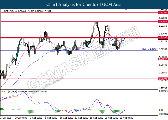 GBPUSD, H4: GBPUSD telah didagang dengan lebih tinggi sementara ia sedang menguji tahap rintangan di 1.3140. MACD yang memaparkan isyarat momentum bullish yang berterusan mencadangkan pasangan ini untuk didagang dengan lebih tinggi selepas ia berjaya memecah tahap rintangan tersebut.