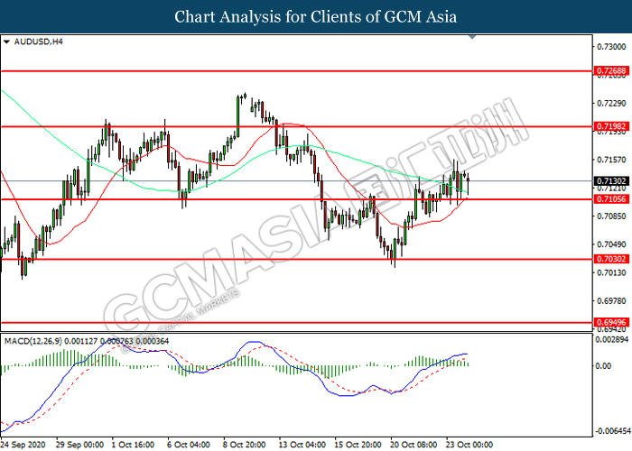 AUDUSD, H4: AUDUSD telah didagang dengan lebih tinggi selepas ia memecah tahap rintangan terdahulu 0.7105. Namun, MACD yang memaparkan momentum bullish yang berkurangan mencadangkan pasangan ini untuk mengalami pembetulan teknikal bagi jangka pendek.