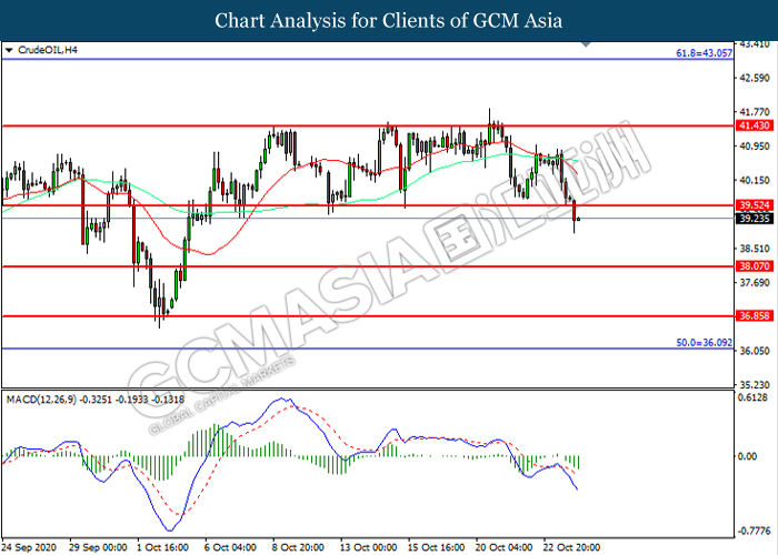 Bagi pasaran komoditi, harga minyak mentah telah menyusut sebanyak 1.46% ke $39.12 se tong semasa penulisan. Pasaran minyak mentah telah didagang dengan lebih rendah susulan dengan para pelabur khuatir bahawa peningkatan kes-kes koronavirus yang mendadak di seluruh dunia akan memberi prospek negatif ke atas permintaan untuk minyak mentah. Sebaliknya, harga emas telah mencatat kerugiannya sebanyak 0.25% ke $1896.45 se troy auns susulan dengan para pelabur menjangkakan bahawa rancangan rangsangan ekonomi koronavirus A.S. akan diluluskan hanya selepas pilihan raya A.S. pada 3hb November 2020.