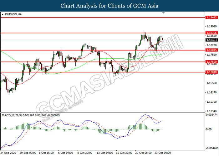 EURUSD, H4: EURUSD telah didagang dengan lebih tinggi sementara kini menguji di tahap rintangan 1.1875. MACD yang memaparkan momentum bearish yang berkurangan mencadangkan pasangan ini untuk melanjutkan keuntungannya selepas ia memecah tahap rintangan tersebut.
