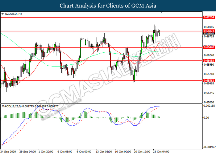 NZDUSD, H4: NZDUSD telah didagang dengan lebih tinggi sementara kini menguji di tahap rintangan 0.6685. Namun, MACD yang memaparkan momentum bullish yang berkurangan mencadangkan pasangan ini untuk mengalami pembetulan teknikal bagi jangka pendek.