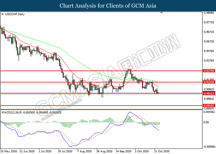 USDCHF, Daily: USDCHF telah didagang dengan lebih rendah sementara kini menguji di tahap sokongan 0.9030. Namun, MACD yang memaparkan momentum bearish yang berkurangan mencadangkan pasangan ini untuk mengalami pembetulan teknikal bagi jangka pendek.