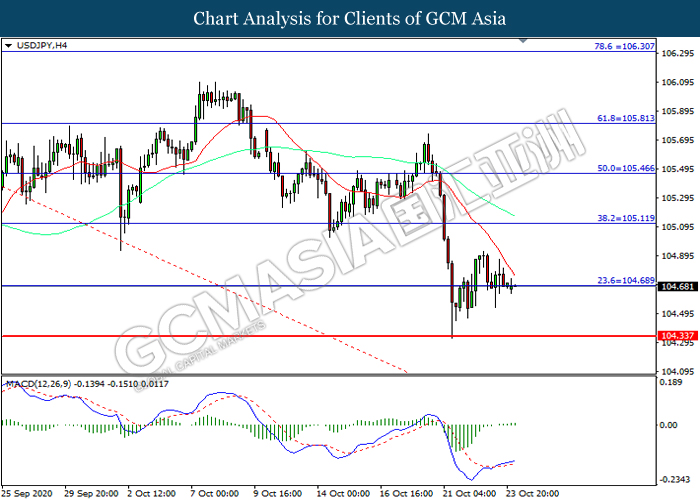 USDJPY, H4: USDJPY telah didagang dengan lebih rendah sementara kini menguji di tahap sokongan 104.70. Namun, MACD yang memaparkan momentum bullish mencadangkan pasangan ini untuk mengalami pembetulan teknikal bagi jangka pendek.