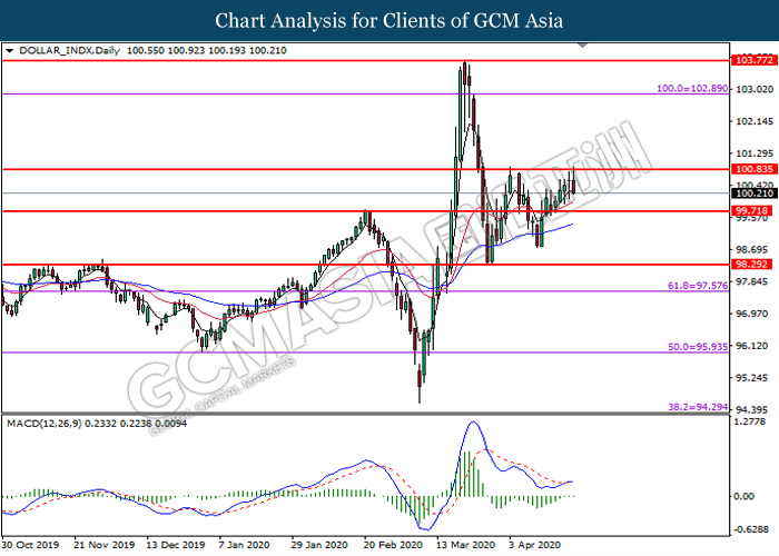 Indeks dolar yang mengukur nilainya terhadap sekumpulan enam mata wang utama jatuh susulan dengan Dewan Kongres telah bersetuju terhadap rancangan rangsangan pusingan baru pada Jumaat lalu. Sejak permulaan penyebaran Koronavirus , kerajaan AS dan Federal Reserve telah melancarkan pelbagai jenis program rangsangan dengan tujuan untuk menyokong ekonomi negara melalui masa pandemik ini. Wang pusingan baru yang bernilai hampir $ 483 bilion bertujuan untuk menyokong perniagaan kecil dan hospital tempatan. Dengan menyuntik sejumlah besar wang tanpa henti ke pasaran untuk memerangi kerosakan penuh Covid-19 terhadap AS, ekonomi AS dipercayai akan dapat dipertingkatkan dalam jangka pendek walaupun kecairan tambahan telah meorosot nilai dolar AS. Walau bagaimanapun, kerugian indeks dolar adalah terhad kerana data ekonomi positif telah sedikit menaikkan daya tarikan indeks dolar. Menurut Census Bureau AS, data Core Durable Goods Orders dibebaskan pada -0.2%, lebih kuat daripada ramalan ekonomi -5.8%, tetapi ia hanya memberikan sedikit pandangan mengenai keadaan ekonomi AS semasa kerana kenaikan ini tidak mungkin berlanjut dalam tempoh pandemik ini. Semasa penulisan, indeks dolar jatuh 0.11% ke 100.20.