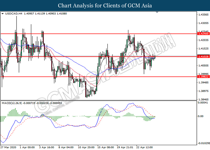 USDCAD, H4: USDCAD telah didagang dengan lebih tinggi sementara ia sedang menguji tahap rintangan di 1.4105. MACD yang menunjukkan isyarat momentum bearish yang berkurangan mencadangkan pasangan ini untuk didagang dengan lebih tinggi selepas ia memecah tahap rintangan di 1.4105.