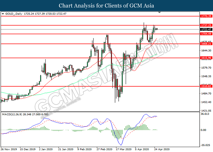 Bagi pasaran komoditi, harga minyak mentah telah melanjutkan kerugiannya sebanyak 0.38% ke $15.82 se tong semasa penulisan. Pasaran minyak mentah telah didagang dengan lebih rendah pada hari ini susulan dengan para pelabur khuatir bahawa kapasiti untuk simpanan minyak mentah adalah tidak mencukupi, yang meningkatkan kebimbangan bahawa pemotongan bekalan minyak mentah adalah tidak cukup effisien untuk menyelesaikan masalah kekurangan permintaan bagi minyak mentah. Sebaliknya, harga emas telah menyusut sebanyak 0.34% ke $1722.65 se troy auns susulan dengan peningkatan sentimen selera risiko dalam pasara FX. Para pelabur menjangkakan bahawa Bank Pusat Global akan terus meringankan dasar monetari dan dasar fiskal untuk memberangsangkan perkembangan ekonomi di dunia.