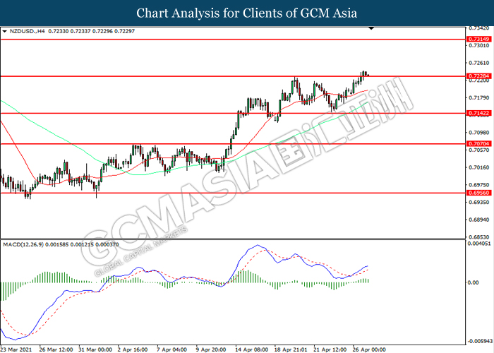 NZDUSD, H4: NZDUSD telah didagang dengan lebih tinggi sementara kini menguji di tahap rintangan 0.7230. MACD yang memaparkan momentum bullish yang berkurangan mencadangkan pasangan ini untuk melanjutkan keuntungannya selepas ia memecah tahap rintangan tersebut.