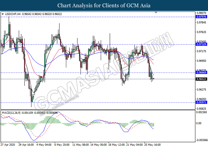 USDCHF, H4: USDCHF telah didagang dengan lebih tinggi berikutan dengan pemecahan pada tahap sokongan sebelumnya 0.9665. MACD yang memaparkan isyarat momentum bearish yang berterusan mencadangkan pasangan ini untuk melanjutkan kerugiannya ke arah tahap sokongan 0.9595.