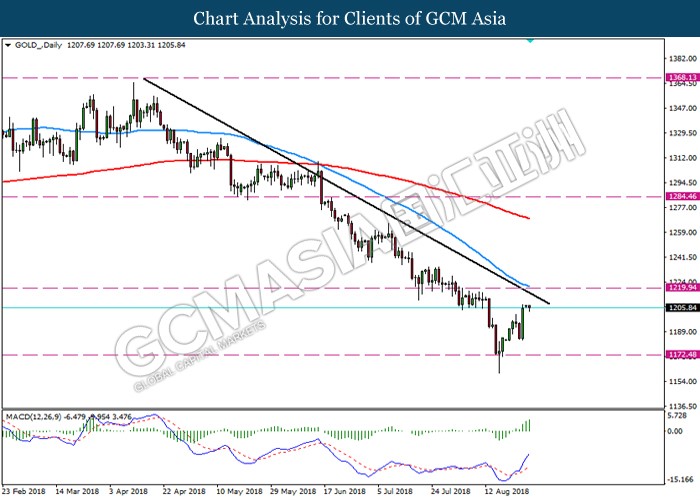 GOLD_, Daily: Harga emas telah didagang dengan lebih tinggi berikutan dengan lantunan daripada tahap sokongan 1172.50 baru-baru ini. Pergerakan harga dan MACD yang memaparkan bias bullish dengan formasi silang emas baru-baru ini mencadangkan komoditi tersebut untuk melanjutkan keuntungannya ke arah tahap rintangan 1220.00.