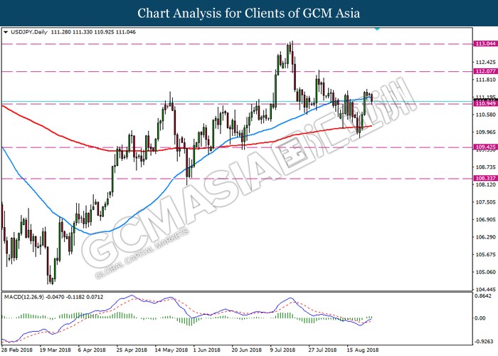USDJPY, Daily: USDJPY telah didagang dengan lebih tinggi berikutan dengan pemecahan pada tahap rintangan sebelumnya 110.95 baru-baru ini. MACD yang memaparkan isyarat bullish dengan formasi silang emas mencadangkan pasangan ini untuk melanjutkan keuntungannya ke arah tahap rintangan 112.05.