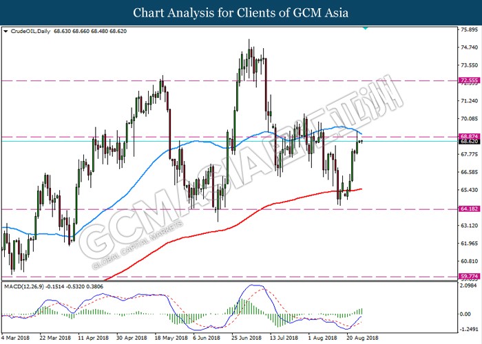 CrudeOIL, Daily: Harga minyak mentah telah didagang dengan lebih tinggi sementara ia sedang menguji tahap rintangan 68.85. Walaupun pergerakan harga dan MACD yang memaparkan momentum bullish dengan formasi silang emas, pemecahan pada tahap rintangan 68.85 adalah diperlukan untuk mendapat pengesahan yang lebih lanjut.