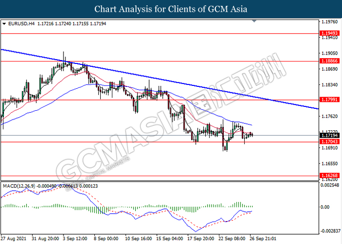 EURUSD, H4: EURUSD telah didagang dengan rata berhampiran dengan tahap sokongan 1.1705. Namun, MACD yang memaparkan isyarat momentum bullish mencadangkan pasangan ini untuk melanjutkan kerugiannya selepas ia memecah tahap sokongan tersebut.
