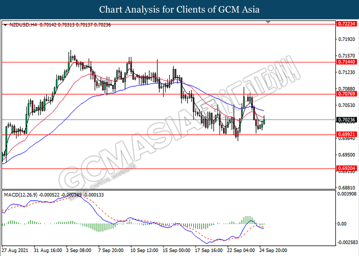 NZDUSD, H4: NZDUSD telah didagang dengan lebih tinggi susulan dengan lantunan dari tahap sokongan 0.6990. MACD yang memaparkan isyarat momentum bearish yang berkurangan mencadangkan pasangan ini untuk melanjutkan lantunannya ke arah tahap rintangan 0.7075.