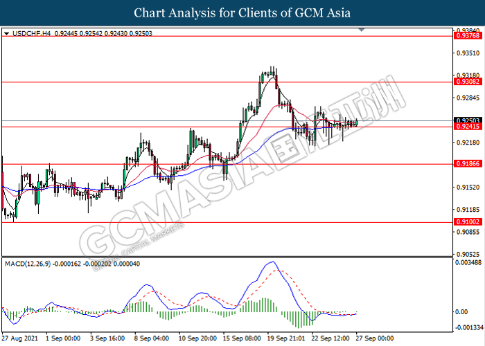 USDCHF, H4: USDCHF telah didagang dengan rata berhampiran dengan tahap sokongan 0.9240. Namun, MACD yang memaparkan isyarat momentum bullish mencadangkan pasangan ini untuk melanjutkan keuntungannya ke arah tahap rintangan 0.9310.