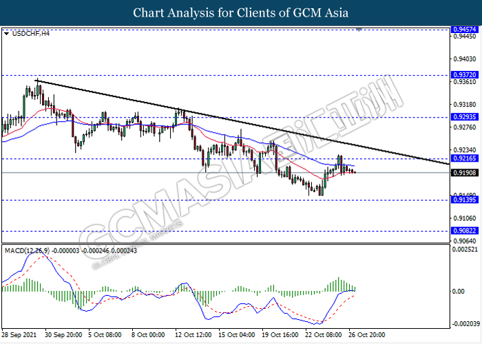 USDCHF, H4: USDCHF telah didagang dengan lebih rendah susulan dengan pengunduran dari tahap rintangan 0.9215. MACD yang memaparkan isyarat momentum bullish yang berkurangan mencadangkan pasangan ini untuk melanjutkan kerugiannya ke arah tahap sokongan 0.9140.