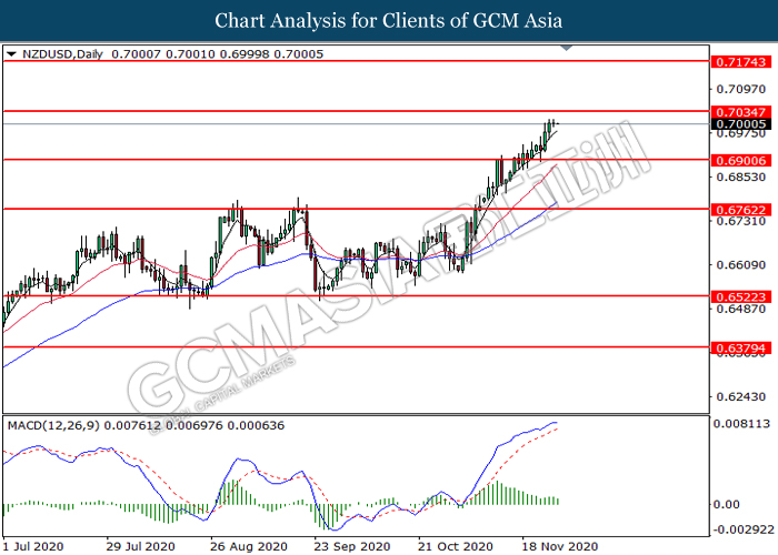 NZDUSD, H4: NZDUSD telah didagang dengan lebih tinggi selepas ia memecah tahap rintangan sebelumnya di 0.6900. MACD yang memaparkan isyarat momentum bullish yang berterusan mencadangkan pasangan ini untuk melanjutkan keuntungannya dan menuju ke arah tahap rintangan di 0.7035.