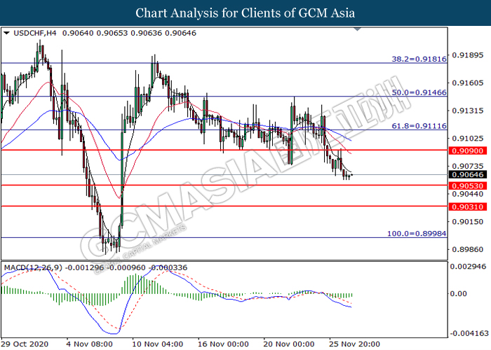 USDCHF, H4: USDCHF telah didagang dengan lebih rendah selepas ia memecah tahap sokongan sebelumnya di 0.9090. MACD yang memaparkan isyarat momentum bearish yang berterusan mencadangkan pasangan ini untuk melanjutkan kerugiannya dan menuju ke arah tahap sokongan di 0.9055.