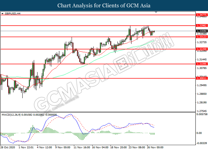 GBPUSD, H4: GBPUSD telah didagang dengan lebih tinggi selepas ia melantun dari tahap sokongan 1.3310. MACD yang memaparkan momentum bearish yang berkurangan mencadangkan pasangan ini untuk melanjutkan keuntungannya ke arah tahap rintangan 1.3400.