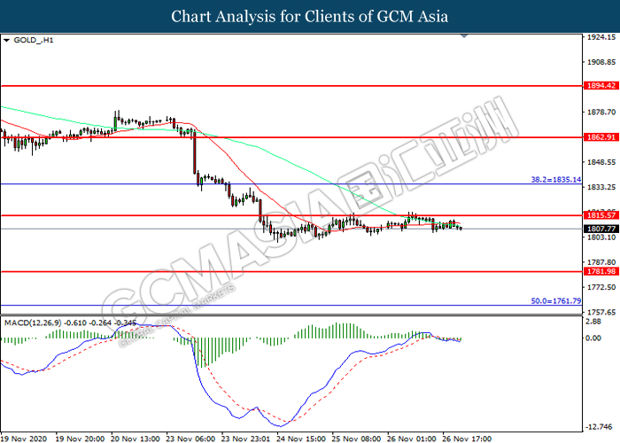 GOLD_, H1: Harga emas telah didagang dalam satu saluran sisi sementara kini menguji di tahap rintangan 1815.60. MACD yang memaparkan momentum bearish mencadangkan komoditi ini untuk didagang dengan lebih rendah ke arah tahap sokongan 1782.00.