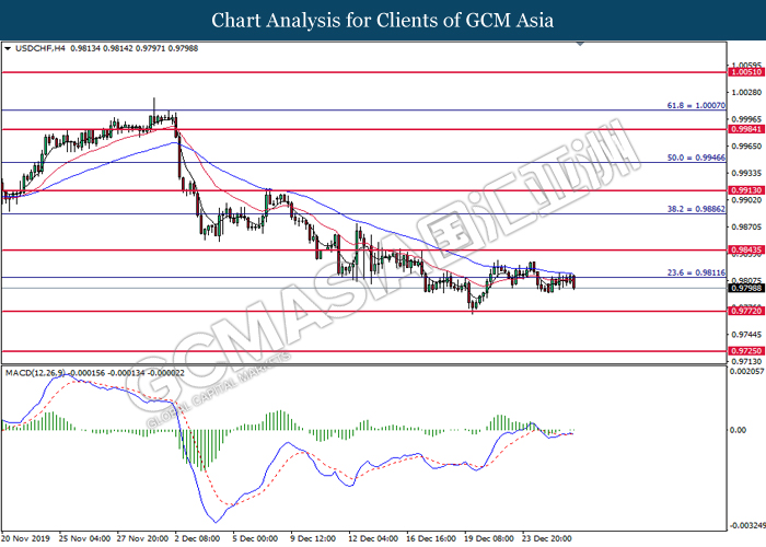 USDCHF, H4: USDCHF telah didagang dengan lebih rendah selepas ia berundur dari tahap rintangan di 0.9810. Oleh kerana kekurangan isyarat daripada MACD, ia dicadangkan untuk menunggu lebih banyak isyarat muncul sebelum memasuki pasaran ini.