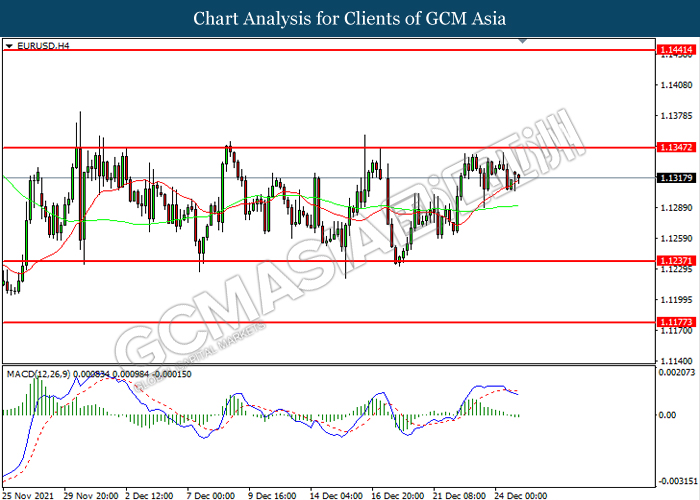 EURUSD, H4: EURUSD telah didagang dengan lebih tinggi sementara kini menguji di tahap rintangan 1.1345. Namun, MACD yang memaparkan momentum bearish mencadangkan pasangan ini untuk mengalami pembetulan teknikal bagi jangka pendek.