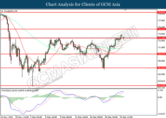 Bagi pasaran komoditi, harga minyak mentah telah menyusut sebanyak 0.53% ke $73.65 se tong semasa penulisan. Harga minyak mentah telah didagang dengan lebih rendah di tengah-tengah peningkatan bilangan varian Omicron di seluruh dunia terus menjejaskan daya tarikan untuk komoditi hitam tersebut. Sebaliknya, harga emas telah meningkat sebanyak 0.10% ke $1810.65 setiap troy auns setakat penulisan di tengah-tengah prospek negatif terhadap varian Omicron telah mencetuskan peralihan sentimen ke arah aset selamat, meningkatkan permintaan pasaran ke atas aset selamat emas.