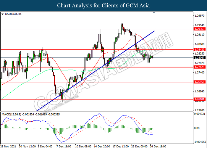 USDCAD, H4: USDCAD telah didagang dengan lebih rendah selepas ia memecah tahap sokongan terdahulu 1.2840. Namun, MACD yang memaparkan momentum bearish yang berkurangan mencadangkan pasangan ini untuk mengalami pembetulan teknikal bagi jangka pendek.
