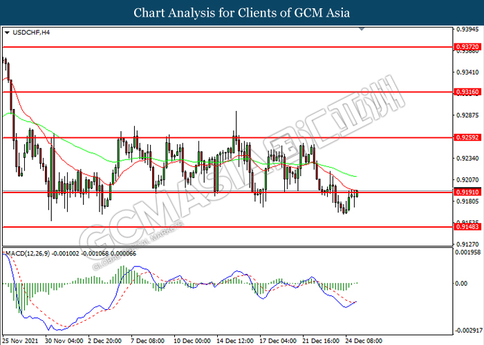 USDCHF, H4: USDCHF telah didagang dengan lebih rendah sementara kini menguji di tahap sokongan 0.9190. Namun, MACD yang memaparkan momentum bullish mencadangkan pasangan ini untuk mencadangkan pasangan ini untuk mengalami pembetulan teknikal bagi jangka pendek.