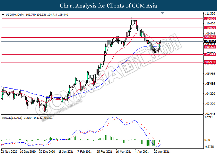 USDJPY, Daily: USDJPY telah didagang dengan lebih tinggi selepas ia memecah tahap rintangan sebelumnya di 108.30. MACD yang memaparkan isyarat momentum bearish yang berkurangan mencadangkan pasangan ini untuk didagang dengan lebih tinggi dan menuju ke arah tahap rintangan di 109.20.