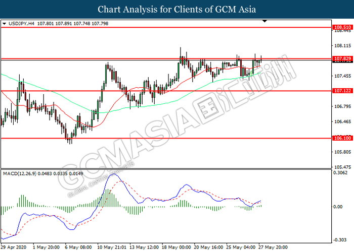 USDJPY, H4: USDJPY telah didagang dengan lebih tinggi sementara kini menguji di tahap rintangan 107.85. MACD yang memaparkan momentum bullish mencadangkan pasangan ini untuk melanjutkan keuntungannya selepas ia memecah tahap rintangan tersebut.