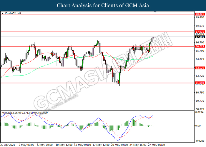 Bagi pasaran komoditi, harga minyak mentah telah meningkat sebanyak 0.57% ke $67.23 se tong semasa penulisan. Pasaran minyak mentah telah didagang dengan lebih tinggi susulan dengan para pelabur membuat jangkaan bahawa permintaan minyak mentah dalam jangka pendek akan meningkat dengan ketara susulan dengan sesi percutian A.S. Persatuan Automobil Amerika Syarikat menjangkakan bahawa sebanyak 37 juta orang akan memandu keretanya untuk perjalanan, meningkat sebanyak 60% daripada jumlah 23 juta yang ditindas oleh pandemi tahun lalu. Sebaliknya, harga emas telah meningkat sebanyak 0.04% ke $1896.65 se troy auns semasa penulisan susulan dengan penyusutan dalam Dolar AS.