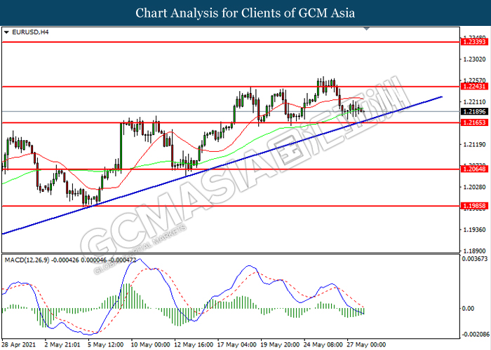 EURUSD, H4: EURUSD telah didagang dengan lebih rendah sementara kini menguji di tahap sokongan 1.2165. Namun, MACD yang memaparkan momentum bearish yang berkurangan mencadangkan pasangan ini untuk mengalami pembetulan teknikal bagi jangka pendek.