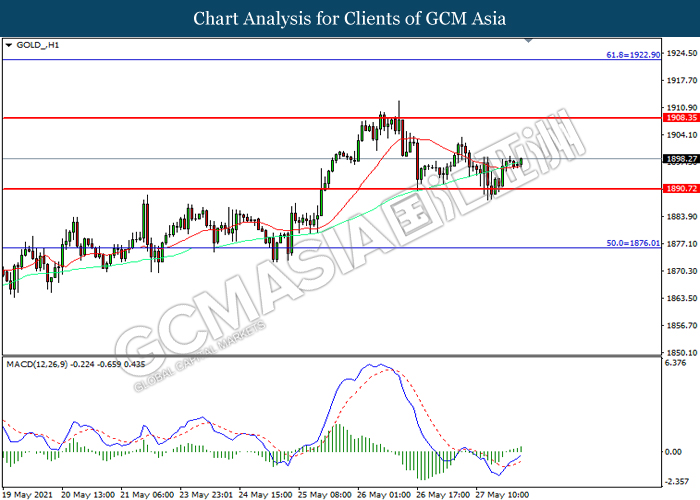 GOLD_, H1: Harga emas telah didagang dengan lebih tinggi selepas ia melantun dari tahap sokongan 1890.70. MACD yang memaparkan momentum bullish mencadangkan komoditi ini untuk melanjutkan keuntungannya ke arah tahap rintangan 1908.35.