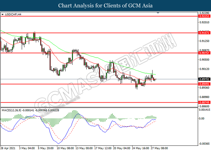 USDCHF, H4: USDCHF telah didagang dengan lebih rendah sementara kini menguji di tahap sokongan 0.8950. MACD yang memaparkan momentum bullish yang berkurangan mencadangkan pasangan ini untuk melanjutkan kerugiannya selepas ia memecah tahap sokongan tersebut.