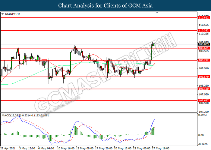 USDJPY, H4: USDJPY telah didagang dengan lebih tinggi selepas ia memecah tahap rintangan terdahulu 109.65. MACD yang memaparkan momentum bullish mencadangkan pasangan ini untuk melanjutkan keuntungannya ke arah tahap rintangan 110.35.