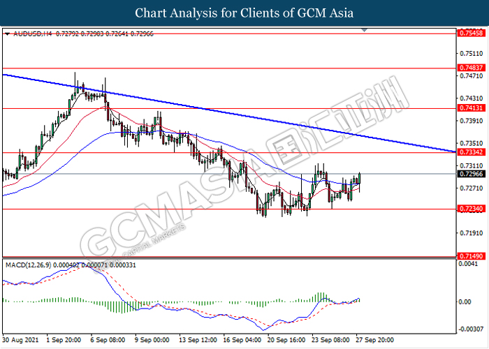 AUDUSD, H4: AUDUSD telah didagang dengan lebih tinggi susulan dengan lantunan dari tahap sokongan 0.7235. MACD yang memaparkan isyarat momentum bullish dengan formasi silang emas mencadangkan pasangan ini untuk melanjutkan lantunannya ke arah tahap rintangan 0.7335.