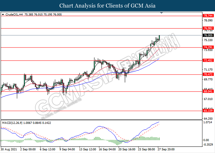 Di pasaran komoditi, harga minyak mentah melanjutkan keuntungannya dan melonjak sebanyak 0.56% kepada $75.81 setong semasa penulisan berikutan dengan prospek permintaan yang meningkat dan bekalan yang ketat. Dengan dunia terus memulih dari pandemik, permintaan minyak global dijangka boleh mencapai tahap pra-pandemik pada awal tahun depan, walaupun dengan kapasiti penapisan yang berlebihan mungkin membebani prospek, menurut kepada pengeluar dan pedagang dalam sebuah persidangan industri. Goldman Sachs juga meningkat ramalannya sebanyak $ 10 pada akhir tahun untuk minyak mentah Brent kepada $ 90 setong. Sebaliknya, harga emas meningkat sebanyak 0.05% kepada $1750.92 se troy auns pada masa penulisan di tengah-tengah penurunan dolar.