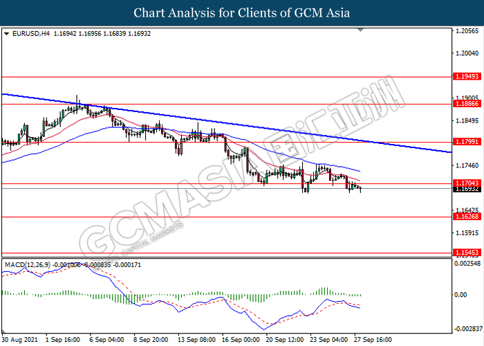 Mata wang Euro yang didagang terhadap dolar dan pasangan mata wang lain kekal ditekan dan jatuh berikutan dengan isyarat dovish baru-baru ini dari ECB. Menurut kepada perkembangan terbaru, Presiden ECB Christine Lagarde mengulas semalam bahawa tahap inflasi di EU telah melebihi sasaran yang telah ditetapkan sebelumnya iaitu 2%. Namun, Lagarde menekankan bahawa kadar inflasi akan menurun dari tahap tinggi setelah harga minyak mentah kembali stabil dan masalah rantaian bekalan diselesaikan menjelang tahun depan. Pandangan yang diberikan oleh Lagarde lebih cenderung kepada nada dovish kerana ECB berkemungkinan akan meneruskan pelonggaran dasarnya selepas program pembelian bon dikurangkan mulai awal tahun depan. Sumber dalaman menyatakan bahawa ECB sedang mempertimbangkan untuk memperkenalkan program pembelian bon yang lebih ketat di mana setiap negara akan mempunyai kuota dan ia tidak termasuk Greece oleh disebabkan kedudukan kreditnya yang lemah. Pada masa penulisan, EUR / USD jatuh sebanyak 0.05% kepada 1.1692.